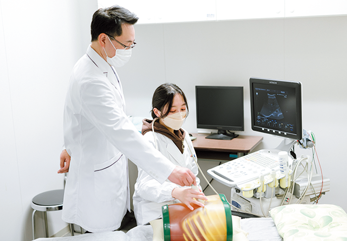 臨床生理学実習 学べる内容 脳波検査や超音波(エコー)検査の専門家で、現場経験豊富な臨床検査技師でもある教員から検査のノウハウを習得します。 身につく力 脳波検査では、てんかんなどの脳疾患の診断が可能です。また、超音波検査では心臓や腹部の病気を発見することができます。