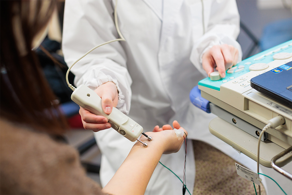 神経伝導検査を練習。電気で神経を刺激するため、痛みを最小限に抑えるのがポイント
