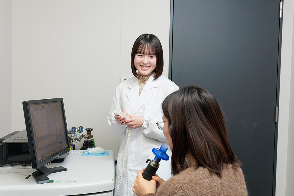 所属する生理学研究室では、現役の臨床検査技師としても活躍されている小野澤先生の指導を受けています。この研究室を選んだきっかけは、先生の臨床経験に基づく「生理学」の授業にあります。先生の講義は検査技術の要点にとどまらず、患者さん一人一人を尊重し、思いやりを持って接することの大切さを教えてくれました。先生は研究室でも丁寧にわかりやすく説明してくださいます。その熱意あるご指導のおかげで理解が深まったと同時に、検査の奥深さを実感できました。