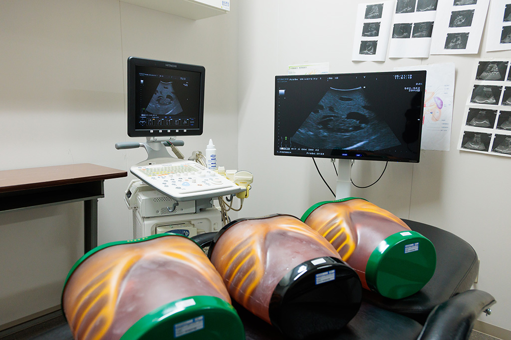 超音波検査の練習用として、ファントム(模型)を使っています。これにより、実際の患者に負担を掛けることなく、安全に繰り返し練習できます。解剖学的に正確なモデルや病変を再現できるため、臨場感のある画像を見ながらプローブを用い、手技を磨いています。