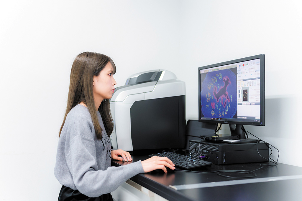 採取した検体を包埋・切片化して標本を作り、その標本をマイクロスコープで観察。これにより、薬の影響による細胞の異変やがんの発生状況を解析できます。パソコンのモニターに拡大画像を映し出すため、研究室のメンバーと画面を見ながら議論することも可能です。
