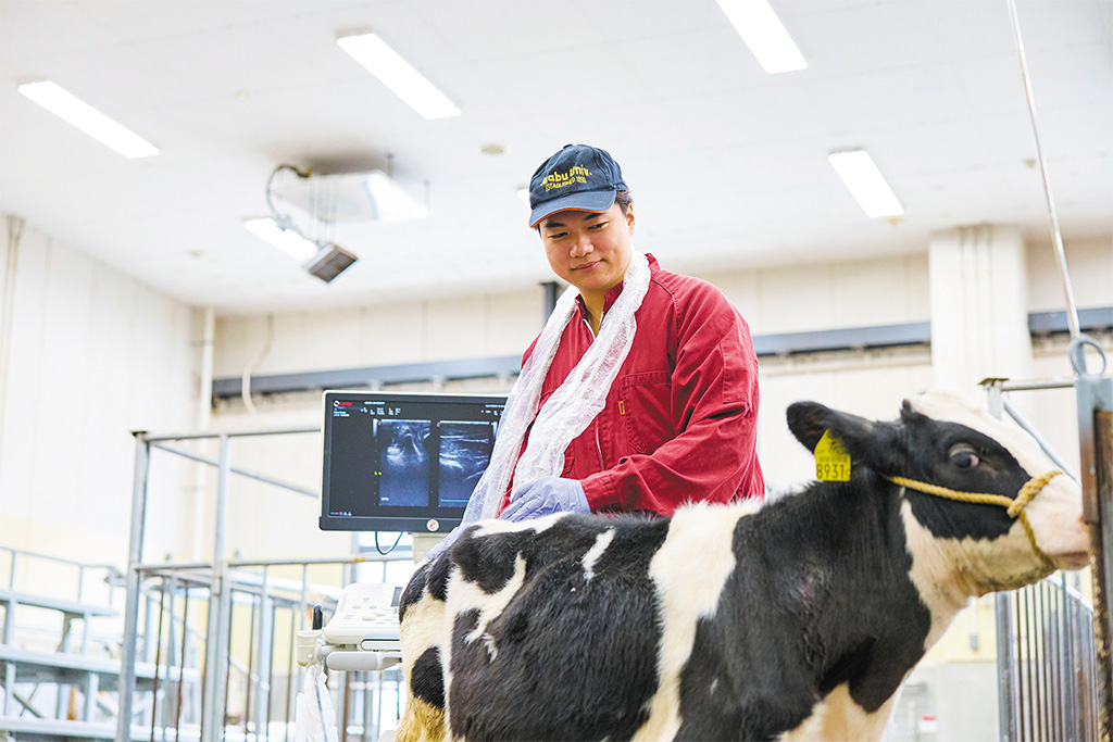 充実した学内の施設で産業動物臨床を学び、経験豊富な先生方の指導のもと、産業動物獣医師をめざす加藤さんの学びをお届けします。