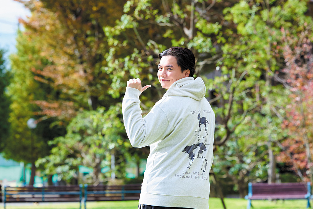 「産業動物内科学研究室」のオリジナルパーカー。バックプリントのイラストが特徴的