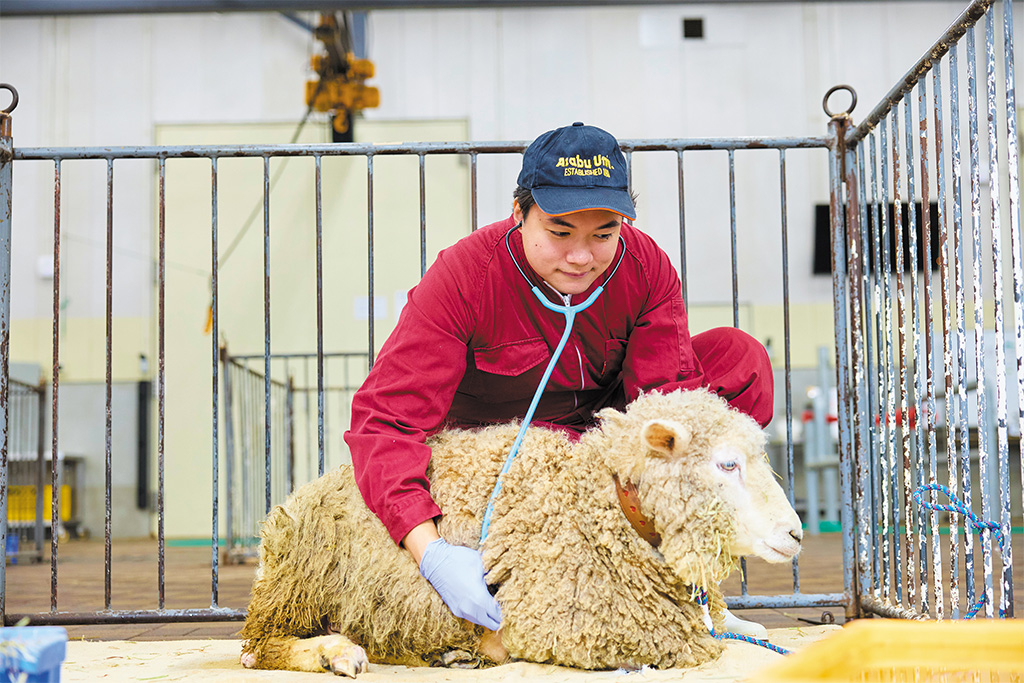 麻布大学を選んだ一番の理由は、首都圏にありながら産業動物分野に力を入れている点です。私が所属する「産業動物内科学研究室」で利用する産業動物臨床教育センター(LAVEC)には、牛がストレスを感じにくい十分な広さの入院スペースや清潔な手術室、そして国内でも有数の大型CTなど、高度な獣医療機器が完備されています。そして研究室では単に知識を覚えるだけでなく、「なぜその薬を使うのか」「なぜこのタイミングで検査が必要なのか」という根拠が常に問われます。膨大な準備や処置の一つ一つに意味を見いだす過程は苦労の連続でしたが、先生方の熱心な指導のもとで経験を積むうちに、点在していた知識がつながり始めました。五感をフルに使って患畜と向き合い、高度な獣医療機器で裏付けを得る日々。この恵まれた環境こそが、確かな獣医療技術を磨くための最短ルートだと実感しています。