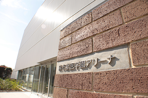 開放感あふれる1階アリーナ部分には、バスケットボールコート2面が同時に使用できる広さを確保。入学式や卒業式などの式典では、約1,700人を収容できる多目的施設です。