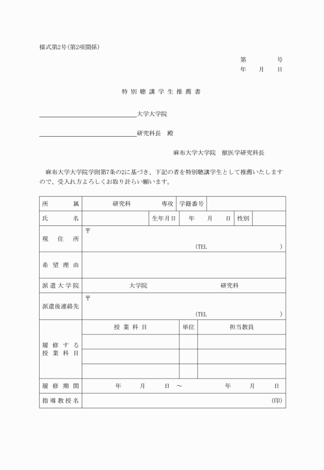 1 この内規により、他の大学院の授業科目の履修を希望する学生(以下「特別聴講学生候補者」という。)は、特別聴講学生出願書(様式第1号)に必要事項を記入し、あらかじめ指導教員の承諾を受けた後、研究科長あてに提出しなければならない。