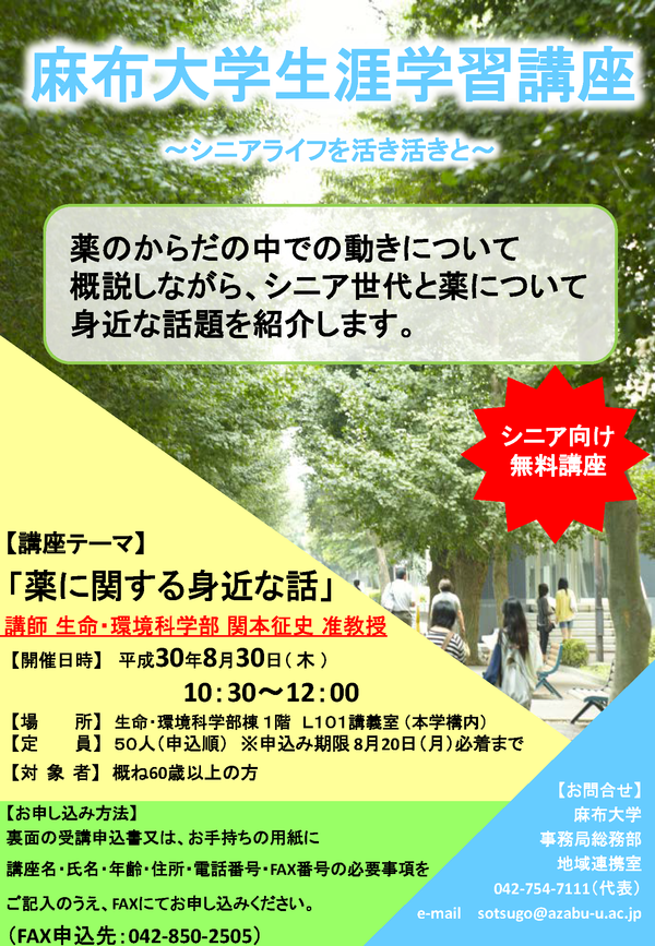 今年度の学習内容は、当初、獣医学科が取り組む薬理学の分野から、薬のからだの中での動きについて概説を予定しておりましたが、より人々の生活に密接した内容として、生命・環境科学部の関本 准教授(薬剤師)に変更し、改めましてシニア世代と薬について身近な話題を紹介します。