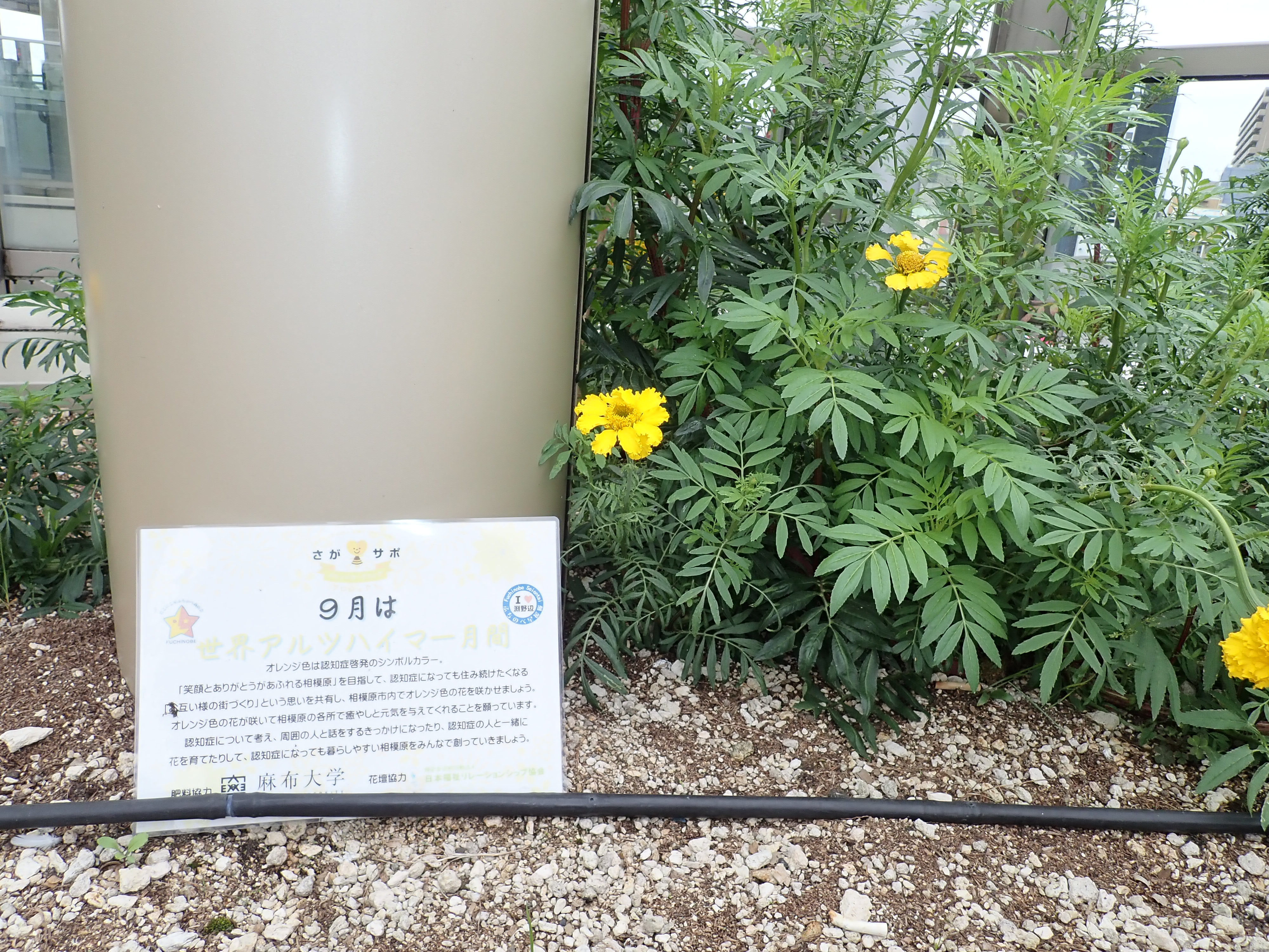 オレンジ色は認知症啓発のシンボルカラーであることから、オレンジ色が強調されるマリーゴールドが植えられました。天候不順が続いたため、花が咲き誇るまでにはなりませんでしたが、認知症啓発活動のお手伝いにはなったと思います。