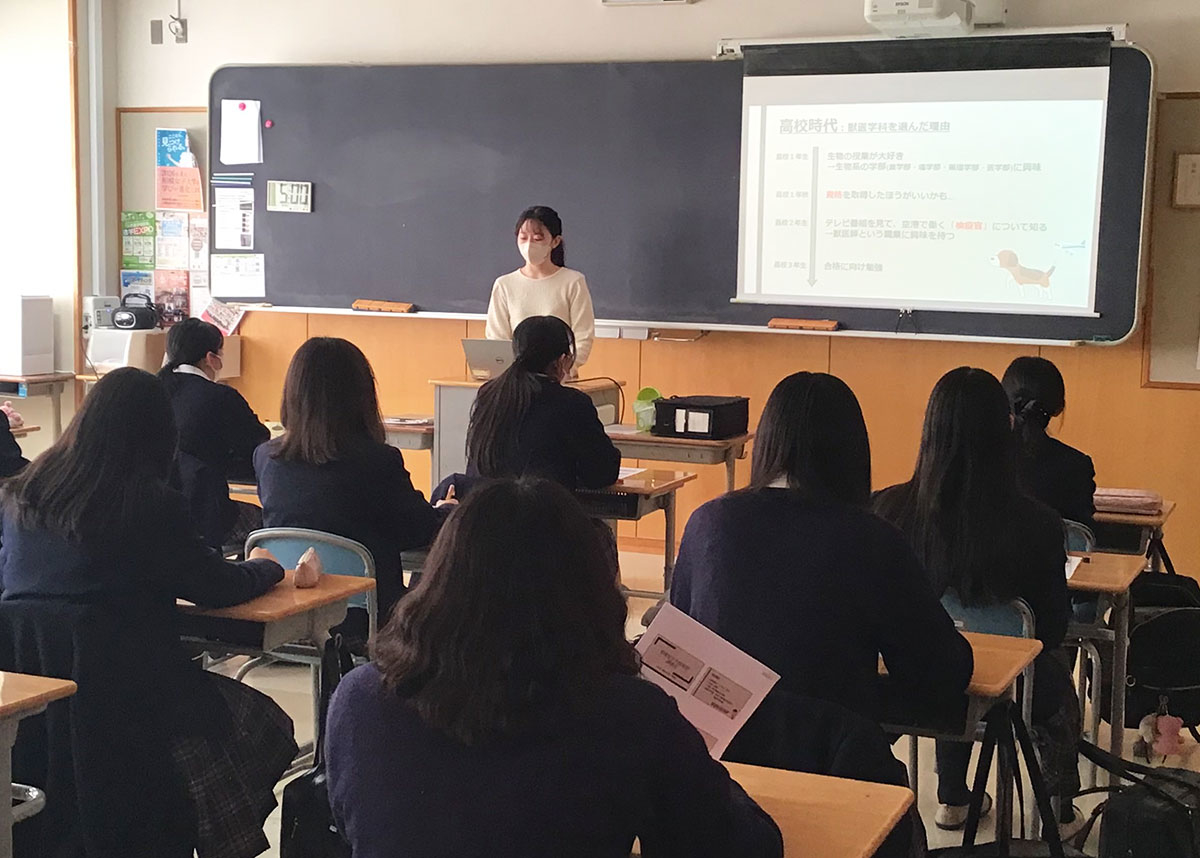 生徒さんたちは、本学獣医学科3年の駒居奈々さん、本学動物応用科学科3年の石田菜月さん、本学食品生命科学科3年の千田理彩子さんによる講演を聞いて、本学に入学した理由や今後の進路などについて、質疑応答が行われ、女子大学生による女子高校生へ女性ならではの視点から、高校生活を送る上でのヒントになるようなアドバイスなどがあり、皆さん大変有意義な1日を過ごしました。